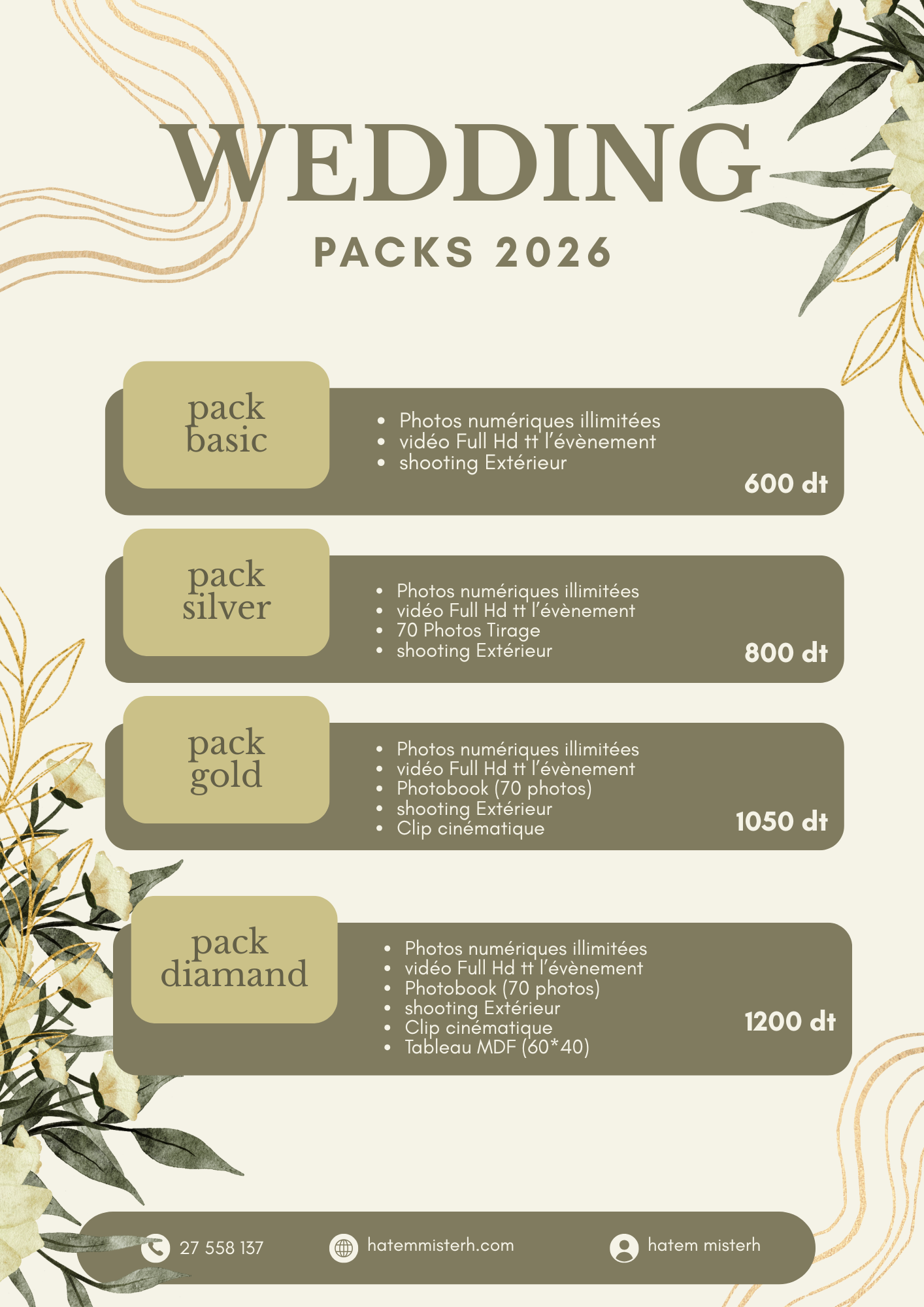Packs Mariages Packs Fiançailles Anniversaire Shooting Grossesse Circoncision Shooting en studio Shooting Produits Packs Mariages Pack Silver Pack Gold Pack Diamand 01 // Contact N’hésitez pas à nous contactez APPELEZ-NOUS POUR TOUTE QUESTION +216 27 558 137 ENVOYEZ-NOUS UN E-MAIL contact@hatemmisterh.com Envoyer